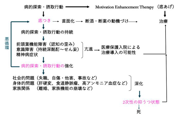 依存症の患者様と治療関係を構築していく上で、医療者vs患者という対立構造にならないようにし、あくまで医療者は依存性物質によって起きている問題を一緒に解決していくための助言者であるというスタンスを重視しています。特に治療プログラムを受けていない外来患者の、「できれば節酒でやりたい」、「すぐに断酒の決心がつかない」などの気持ちは受容しつつ、現状、節酒は暫定的な治療目標であり、リスクも大きく、病的探索・摂取行動が持続すると重症化していく可能性があることを説明しています(図1)。その上で、どのような状態になったら断酒が必要と決断できるか患者と話しあい、治療が中断しないことを重視しています。
